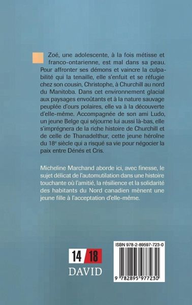 Zoé, une adolescente, à la fois métisse et franco-ontarienne, est mal dans sa peau. Pour affronter ses démons et vaincre la culpabilité qui la tenaille, elle s'enfuit et se réfugie chez son cousin, Christophe, à Churchill au nord du Manitoba. Dans cet environnement glacial aux paysages envoûtants et à la nature sauvage peuplée d'ours polaires, elle va à la découverte d'elle-même. Accompagnée de son ami Ludo, un jeune Belge qui séjourne lui aussi là-bas, elle s'imprégnera de la riche histoire de Churchill et de celle de Thanadelthur, cette jeune héroïne du 18e siècle qui a risqué sa vie pour négocier la paix entre Dénés et Cris. Micheline Marchand aborde ici, avec finesse, le sujet délicat de l'automutilation dans une histoire touchante où l'amitié, la résilience et la solidarité des habitants du Nord canadien mènent une jeune fille à l'acceptation d'elle-même.