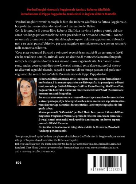 "Perduti luoghi ritrovati" raccoglie le foto che Roberta Giuffrida ha fatto a Poggioreale, borgo del trapanese abbandonato dopo il terremoto del Belìce. Con le fotografie di questo libro Roberta Giuffrida ha vinto il primo premio del concorso "Un luogo per ZeroBook" nel 2019, presieduto da Armando Rotoletti. Il concorso annuale promuove la fotografia di luoghi e aspetti del paesaggio umano abbandonati e su cui si punta l'obiettivo per una maggiore attenzione e cura, e per un recupero nella memoria collettiva. "Cosa state vedendo? Davanti a voi sono i reperti drammatici di un terremoto (1968) che ha sradicato uomini, animali, case; un destino di morte che la nostra fotografa interpella sprigionando con la sua visione nuove ragioni di vita. Ma davanti a noi sono, anche, costruzioni distrutte da eventi naturali senz'altro catastrofici che sono divenuti segni del ricordo, capaci di narrarci di un tempo passato sul quale non vogliamo che scendi l'oblio" (dalla Presentazione di Pippo Pappalardo). *** "Lost places, found again" collects the photos that Roberta Giuffrida shot in Poggioreale, an ancient village in Trapani abandoned after the Belìce earthquake. Roberta Giuffrida won the Photo Contest "Un luogo per ZeroBook" in 2019, chaired by Armando Rotoletti. That Photo Contest promotes lost human places that need more attention and care, and a recovery in collective memory. "What do you see? Look at the tragic ruins of the earthquake (1968) which uprooted men, animals, houses. Through her vision the photographer challenges this destiny of death releasing new reasons for life. These buildings, destroyed by catastrophic natural events, have also become symbols of remembrance - preventing this past event from oblivion" (From Introduction by Pippo Pappalardo)