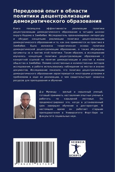 Kniga poswqschena äffektiwnosti realizacii politiki decentralizacii demokraticheskogo obrazowaniq w chetyreh shkolah okruga Kadoma w Zimbabwe. Issledowatel' proanalizirowal literaturu i obsudil koncepciü realizacii politiki decentralizacii demokraticheskogo obrazowaniq i to, kak ona primenqetsq na praktike w Zimbabwe. Byla izlozhena teoreticheskaq osnowa politiki demokraticheskoj decentralizacii obrazowaniq, a takzhe obsuzhdeny argumenty za i protiw ätoj politiki. Takim obrazom, w issledowanii izuchalas' koncepciq politiki decentralizacii obrazowaniq s konkretnoj ssylkoj na ponqtiq demokratizacii i uchastiq w zhizni obschestwa w Zimbabwe. Pomimo kachestwennyh i kolichestwennyh metodow issledowaniq, w rabote ispol'zowalis' nablüdeniq na mestah i analiz dokumentow. Issledowanie pokazalo, chto politika decentralizacii demokraticheskogo obrazowaniq harakterizuetsq nekotorymi uspehami i problemami w hode ee realizacii, o chem swidetel'stwuet nehwatka resursow dlq prepodawaniq i obucheniq.