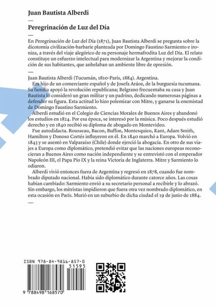 En Peregrinación de Luz del Día (1871), Juan Bautista Alberdi se pregunta sobre la dicotomía civilización-barbarie planteada por Domingo Faustino Sarmiento e ironiza, a través del viaje alegórico de su personaje hermafrodita Luz del Día. El relato constituye un esfuerzo intelectual para modernizar la Argentina y mejorar la condición de sus habitantes, que anhelan un ambiente libre de opresión.