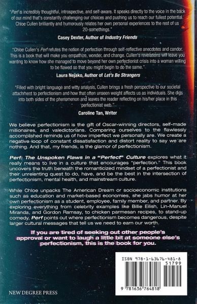 We believe perfectionism is the gift of Oscar-winning directors, self-made millionaires, and valedictorians. Comparing ourselves to the flawlessly accomplished reminds us of how imperfect we personally are. We create a negative loop of constant dissatisfaction and distort reality to say we are nothing. And that, my friends, is the glamor of perfectionism. Perf: The Unspoken Flaws in a "Perfect" Culture explores what it really means to live in a culture that encourages "perfection." This book uncovers the truth beneath the romanticized mindset of a perfectionist and their unrelenting quest to do, have, and be the best in the intersection of perfectionism, mental health, and mainstream culture. While Chloe unpacks The American Dream or socioeconomic institutions such as education and market-based economies, she jabs humor at her own perfectionism as a student, employee, family member, and partner. By exploring everything from celebrity examples like Billie Eilish, Lin-Manuel Miranda, and Gordon Ramsay, to chicken parmesan recipes, to stand-up comedy, Perf points out where perfectionism becomes dangerous, despite larger cultural messages that tell us we need to earn our worth. If you are tired of seeking out other people's approval or want to laugh a little bit at someone else's perfectionism, this is the book for you.