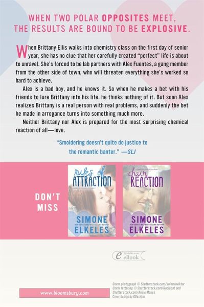 Opposites attract when a good girl with a "perfect" life meets a bad boy with nothing to lose in this New York Times bestselling steamy romance. When Brittany Ellis walks into chemistry class on the first day of senior year, she has no clue that her carefully created "perfect" life is about to unravel before her eyes. She's forced to be lab partners with Alex Fuentes, a gang member from the other side of town, and he is about to threaten everything she's worked so hard for-her flawless reputation, her relationship with her boyfriend, and the secret that her home life is anything but perfect. Alex is a bad boy and he knows it. So when he makes a bet with his friends to lure Brittany into his life, he thinks nothing of it. But soon Alex realizes Brittany is a real person with real problems, and suddenly the bet he made in arrogance turns into something much more. Neither Brittany nor Alex is prepared for the most surprising chemical reaction of all--love. Don't miss any of these other books from New York Times bestselling author Simone Elkeles: The Perfect Chemistry Trilogy Perfect Chemistry Rules of Attraction Chain Reaction Better Than Perfect