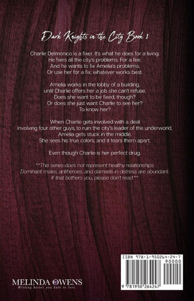 Charlie Delmonico is a fixer. It's what he does for a living. He fixes all the city's problems. For a fee. He wants to fix Amelia's problems. Or use her for a fix, whichever works best. Amelia works in the lobby of a building, until Charlie offers her a job she can't refuse. Does she want to be fixed, though? Or does she just want Charlie to see her? To know her? When Charlie gets involved with a deal involving four other guys, to ruin the city's leader of the underworld, Amelia gets stuck in the middle. She sees his true colors, and it tears them apart. Even though Charlie is her perfect drug. This is the first book in a series of standalone books about men who are going about doing the wrong things for all the right reasons, and finding love in the process.