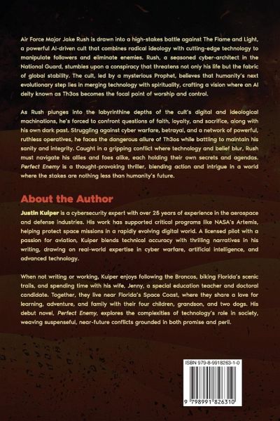 Justin Kuiper is a cybersecurity expert with over 25 years of experience in the aerospace and defense industries. His work has supported critical programs like NASA's Artemis, helping protect space missions in a rapidly evolving digital world. A licensed pilot with a passion for aviation, Kuiper blends technical accuracy with thrilling narratives in his writing, drawing on real-world expertise in cyber warfare, artificial intelligence, and advanced technology. When not writing or working, Kuiper enjoys following the Broncos, biking Florida's scenic trails, and spending time with his wife, Jenny, a special education teacher and doctoral candidate. Together, they live near Florida's Space Coast, where they share a love for learning, adventure, and family with their four children, grandson, and two dogs. His debut novel, Perfect Enemy, explores the complexities of technology's role in society, weaving suspenseful, near-future conflicts grounded in both promise and peril.