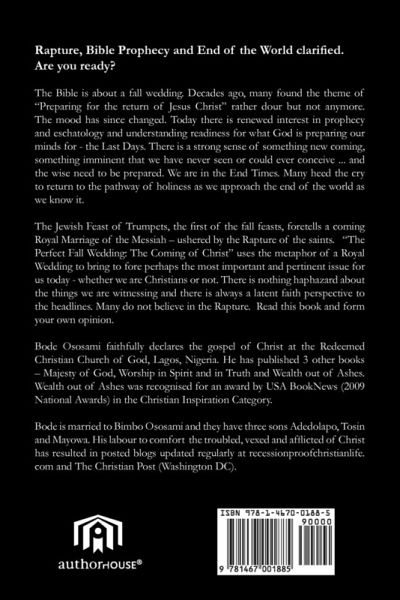 What is the Bible about? The Bible is about a fall wedding. Decades ago, many found the theme of "Preparing for the return of Christ" rather dour but not anymore. The mood has since changed. Today there is renewed interest in eschatology and understanding readiness for what God is preparing our minds for - the End Times. There is a strong sense of something new coming, something imminent that we have never seen or could ever conceive ... and the wise need to be prepared. Many heed the cry to return to the pathway of holiness as we approach the end of the world as we know it. The Jewish Feast of Trumpets, the first of the fall feasts, foretells a coming Royal Marriage of the Messiah - ushered by the Rapture of the saints. "The Perfect Fall Wedding:The Coming of Christ" uses the metaphor of a Royal Wedding to bring to fore perhaps the most important and pertinent issue for us today - whether we are Christians or not ... and that is the rapture. There is nothing haphazard about the things we are witnessing and there is always a latent faith perspective to the headlines.