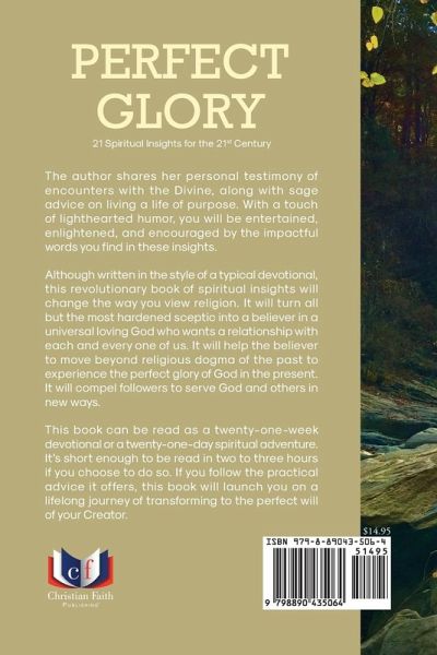 Discover the perfect glory of God--and your place within it. In Perfect Glory, the author shares her personal journey of divine encounters and spiritual awakening, offering 21 life-changing insights to help you walk in alignment with your Creator's purpose. With a blend of wisdom, lighthearted humor, and heartfelt re¿ection, this powerful book will entertain, enlighten, and encourage anyone seeking a deeper spiritual connection. What You'll Experience:A relatable, testimony-based approach to spiritual growth Fresh, thought-provoking insights that challenge traditional religious dogma An uplifting guide for skeptics, seekers, and faithful followers alike Practical steps toward living a life of love, purpose, and divine transformation How to Read This Book: Use Perfect Glory as a:21-day spiritual adventure 21-week devotional journey 2-hour inspirational read with long-lasting impact Follow the practical advice inside, and this book will launch you on a lifelong path of growth, service, and transformation in the perfect will of your Creator. Whether you've been hurt by religion, curious about faith, or seeking renewed purpose, this book will help you experience the glory of a loving God, right here, right now.