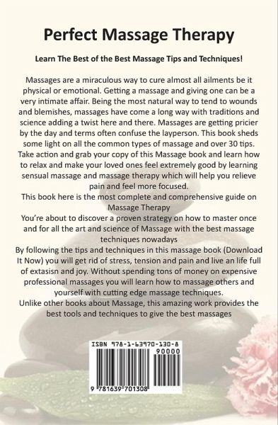 Learn The Best of the Best Massage Tips and Techniques! Massages are a miraculous way to cure almost all ailments be it physical or emotional. Getting a massage and giving one can be a very intimate affair. Being the most natural way to tend to wounds and blemishes, massages have come a long way with traditions and science adding a twist here and there. Massages are getting pricier by the day and terms often confuse the layperson. This book sheds some light on all the common types of massage and over 30 tips. Take action and grab your copy of this Massage book and learn how to relax and make your loved ones feel extremely good by learning sensual massage and massage therapy which will help you relieve pain and feel more focused. This book here is the most complete and comprehensive guide on Massage Therapy You're about to discover a proven strategy on how to master once and for all the art and science of Massage with the best massage techniques nowadays By following the tips and techniques in this massage book (Download It Now) you will get rid of stress, tension and pain and live an life full of extasisn and joy. Without spending tons of money on expensive professional massages you will learn how to massage others and yourself with cutting edge massage techniques. Unlike other books about Massage, this amazing work provides the best tools and techniques to give the best massages Download your copy today!