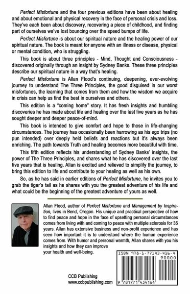 Perfect Misfortune and the four previous editions have been about healing and about emotional and physical recovery in the face of personal crisis and loss. They've each been about discovery, recovering a piece of childhood, and finding part of ourselves we've lost bouncing over the speed bumps of life. Perfect Misfortune is about our spiritual nature and the healing power of our spiritual nature. The book is meant for anyone with an illness or disease, physical or mental condition, who is struggling. This book is about three principles - Mind, Thought and Consciousness - discovered originally through an insight by Sydney Banks. These three principles describe our spiritual nature in a way that's healing. Perfect Misfortune is Allan Flood's continuing, deepening, ever-evolving journey to understand The Three Principles, the good disguised in our worst misfortunes, the learning that comes from them and how the wisdom we acquire in crisis can help us find the best in ourselves and others. This edition is a "coming home" story. It has fresh insights and humbling discoveries he has made about life and healing over the last five years as he has sought deeper and deeper peace-of-mind. This book is intended to give comfort and hope to those in life-changing circumstances. The journey has occasionally been harrowing as his ego trips (no pun intended) over deeply held beliefs and reactions but it's always been enriching. The path towards Truth and healing becomes more beautiful with time. This fifth edition reflects his understanding of Sydney Banks' insights, the power of The Three Principles, and shares what he has discovered over the last five years that is healing. Allan is excited and relieved to simplify the journey, to bring this edition to life and contribute to your healing as well as his own. So, as he has said in earlier editions of Perfect Misfortune, he invites you to grab the tiger's tail as he shares with you the greatest adventure of his life and what could be the beginning of the greatest adventure of yours as well. About the Author: Allan Flood, author of Perfect Misfortune and Management by Inspiration, lives in Bend, Oregon. His unique and practical perspective of how to find peace and hope in the face of upsetting personal circumstances comes from living with and coming to peace with multiple sclerosis for 35 years. Allan has extensive business and non-profit experience and has seen how important it is to understand where the human experience comes from. With humor and personal warmth, Allan shares with you his insights and how they can improve your health and well-being.