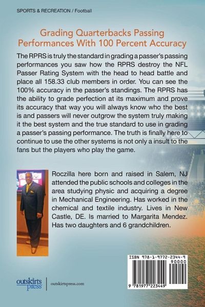 The truth is finally here the RPRS is the only passer rating system that grades a quarterback's passing performances with 100% accuracy and can prove its accuracy. See it destroy the NFL passer rating system in a head to head battle on passing efficiency and put all 77 members of the 158.33 club in order 1 to 77 showing who is the best passer is of all time. The RPRS supplies you with the knowledge of why the other systems are failing and collapsing. The RPRS is so accurate you can see the accuracy in the passer's standings. With the skills the RPRS has truly males it without a doubt the true…mehr