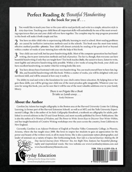 You can teach your child read and write in just sixty lessons! Using the time-tested phonics method of teaching reading, and beginning with a simple italic style of handwriting, this book is designed as a one-stop resource that will help your child master perfect reading and beautiful handwriting. Perfect Reading, Beautiful Handwriting is the book for you if . . . 1. You would like to teach your four or five year-old to read perfectly and write in a simple, attractive style in sixty days time. Teaching your child these all-important skills will undoubtedly be one of the most rewarding experiences that you and your child will ever have together. The complete step-by-step program presented in this book will make it both simple and fun. 2. You have an older child who is experiencing difficulty learning to read in school. Most reading problems are caused by ineffective instruction methods used in the schools. This book uses the most time-tested, effective method possible-phonics. Your child will almost certainly be reading at his grade level or beyond within a matter of weeks of your tutoring him with the help of this book. 3. Your child can read well, but has poor handwriting skills. Most people in the computer generation have bad handwriting, and this due to poor instruction methods. The fact is, though, that everyone can have beautiful handwriting if only they are taught how! This book teaches Italic, the easiest to learn, fastest to write, most legible and attractive handwriting style possible. Within a few weeks of using this book, your child can have excellent handwriting, no matter what his writing looks like now. 4. You have always been frustrated with your own handwriting. You can teach yourself how to have fast, legible, and beautiful handwriting with this book. Within a matter of weeks, you will be delighted with your newfound skill, and will be amazed at how easy it really is. The ability to read and write is the foundation for your chid's entire future education. By helping him or her gain these skills, you will be giving your child one of the most priceless gifts imaginable. Whatever your reasons for using this book, you can be sure that it will be one of the most valuable additions ever to your family library.