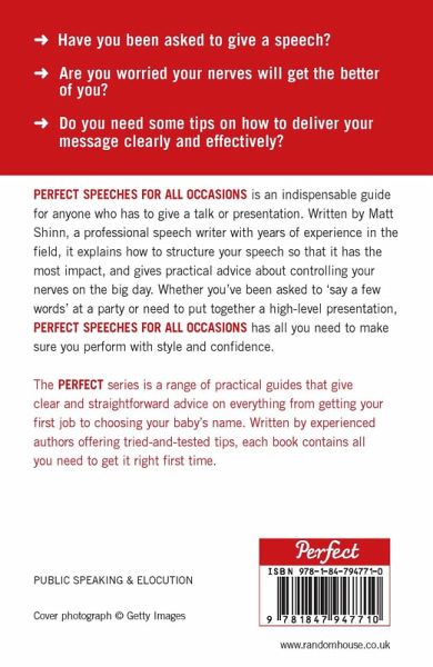 Have you been asked to give a speech?Are you worried your nerves will get the better of you?Do you need some tips on how to deliver your message clearly and effectively?Perfect Speeches for All Occasions is an indispensable guide for anyone who has to give a talk or presentation.