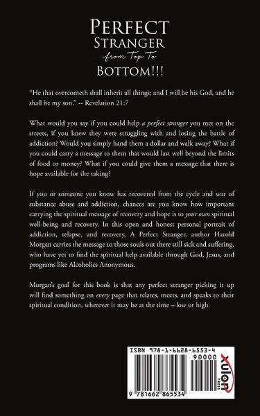 "He that overcometh shall inherit all things; and I will be his God, and he shall be my son." -- Revelation 21:7 What would you say if you could help a perfect stranger you met on the streets, if you knew they were struggling with and losing the battle of addiction? Would you simply hand them a dollar and walk away? What if you could carry a message to them that would last well beyond the limits of food or money? What if you could give them a message that there is hope available for the taking? If you or someone you know has recovered from the cycle and war of substance abuse and addiction, chances are you know how important carrying the spiritual message of recovery and hope is to your own spiritual well-being and recovery. In this open and honest personal portrait of addiction, relapse, and recovery, A Perfect Stranger, author Harold Morgan carries the message to those souls out there still sick and suffering, who have yet to find the spiritual help available through God, Jesus, and programs like Alcoholics Anonymous. Morgan's goal for this book is that any perfect stranger picking it up will find something on every page that relates, meets, and speaks to their spiritual condition, wherever it may be at the time - low or high.