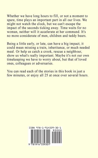 Whether we have long hours to fill, or not a moment to spare, time plays an important part in all our lives. We might not watch the clock, but we can't escape the impact of the seconds ticking away. Time waits for no woman, neither will it accelerate at her command. It's no more considerate of men, children and teddy bears. Being a little early, or late, can have a big impact; it could mean missing a train, inheritance, or much needed meal. Or help us catch a crook, rescue a neighbour, show us what's really important. Maybe it's not our own timekeeping we have to worry about, but that of loved ones, colleagues or adversaries. You can read each of the stories in this book in just a few minutes, or enjoy all 25 at once over several hours.