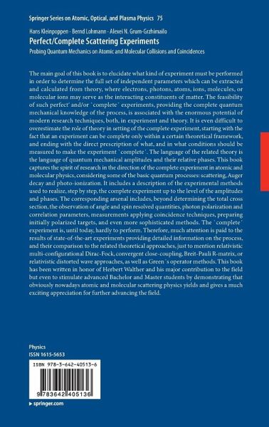 The main goal of this book is to elucidate what kind of experiment must be performed in order to determine the full set of independent parameters which can be extracted and calculated from theory, where electrons, photons, atoms, ions, molecules, or molecular ions may serve as the interacting constituents of matter. The feasibility of such perfect' and-or `complete' experiments, providing the complete quantum mechanical knowledge of the process, is associated with the enormous potential of modern research techniques, both, in experiment and theory. It is even difficult to overestimate the role of theory in setting of the complete experiment, starting with the fact that an experiment can be complete only within a certain theoretical framework, and ending with the direct prescription of what, and in what conditions should be measured to make the experiment `complete'. The language of the related theory is the language of quantum mechanical amplitudes and their relative phases. This book captures the spirit of research in the direction of the complete experiment in atomic and molecular physics, considering some of the basic quantum processes: scattering, Auger decay and photo-ionization. It includes a description of the experimental methods used to realize, step by step, the complete experiment up to the level of the amplitudes and phases. The corresponding arsenal includes, beyond determining the total cross section, the observation of angle and spin resolved quantities, photon polarization and correlation parameters, measurements applying coincidence techniques, preparing initially polarized targets, and even more sophisticated methods. The `complete' experiment is, until today, hardly to perform. Therefore, much attention is paid to the results of state-of-the-art experiments providing detailed information on the process, and their comparison to the related theoretical approaches, just to mention relativistic multi-configurational Dirac-Fock,convergent close-coupling, Breit-Pauli R-matrix, or relativistic distorted wave approaches, as well as Green's operator methods. This book has been written in honor of Herbert Walther and his major contribution to the field but even to stimulate advanced Bachelor and Master students by demonstrating that obviously nowadays atomic and molecular scattering physics yields and gives a much exciting appreciation for further advancing the field.