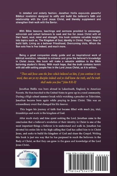 In detailed and orderly fashion, Jonathan Hollis expounds powerful Biblical revelation designed to edify and build the believer's faith and relationship with the Lord Jesus Christ, and thereby supplement and strengthen their walk with the Savior. With Bible lessons, teachings and sermons provided to encourage, admonish and exhort believers to seek and live for Jesus Christ with all their heart, soul, mind and strength, this book contains valuable insights into topics such as, The Kingdom of God, Identity in Christ, Prayer, How to build faith, Living as a believer Priesthood, Overcoming trials, Whom the Son sets free is free indeed, and much more. Being a great companion study guide and an inspirational work of biblical revelation, intended to enhance and grow the believer's knowledge in Christ Jesus, this book will make a valuable addition to the Bible believing student's library. With much hope, that the truth contains herein with aid with setting people free in the Lord Jesus Christ, as it is written, "Then said Jesus unto the Jews which believed on him, if you continue in my word, then are ye my disciples indeed: and ye shall know the truth, and the truth shall make you free." John 8:31-32