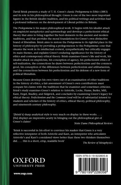 David Brink presents a study of T. H. Green's classic Prolegomena to Ethics (1883) and its role in his philosophical thought. Green is one of the two most important figures in the British idealist tradition, and his political writings and activities had a profound influence on the development of Liberal politics in Britain. The Prolegomena is his major philosophical work. It begins with his idealist attack on empiricist metaphysics and epistemology and develops a perfectionist ethical theory that aims to bring together the best elements in the ancient and modern traditions, and that provides the moral foundations for Green's own distinctive brand of liberalism. Brink aims to restore the Prolegomena to its rightful place in the history of philosophy by providing a prolegomenon to the Prolegomena - one that situates the work in its intellectual context, sympathetically but critically engages its main themes, and explains Green's enduring significance for the history of ethics and contemporary ethical theory. Brink examines Green's life and work, his idealist attack on empiricism, his conception of agency, his perfectionist ethics of self-realization, the connections he draws between perfectionism and the common good, his conception of the differences between perfectionism and utilitarianism, and the connections between his perfectionism and his defense of a new form of political liberalism. Because Green develops his own views out of an examination of other traditions in the history of ethics, a fair assessment of Green's own contributions must compare his claims with the traditions that he examines and sometimes criticizes. Brink's study examines Green's relation to Aristotle, Locke, Hume, Butler, Mill, Kant, Hegel, Bradley, and Sidgwick, and concludes by examining Green's legacy for ethical theory. Perfectionism and the Common Good will be of substantial interest to students and scholars of the history of ethics, ethical theory, political philosophy, and nineteenth century philosophy.