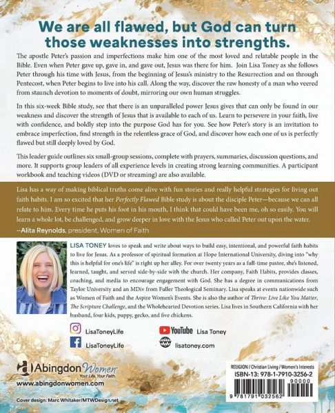 The Perfectly Flawed Leader Guide outlines six small group sessions complete with prayers, summaries, discussion questions, and video viewer guides. The leader guide will support group leaders of all experience levels in creating strong learning communities. In Perfectly Flawed, Lisa Toney shows how the apostle Peter's passion and imperfections make him one of the Bible's most loved and relatable people. Even when Peter gave up, gave in, and gave out, Jesus was there for him. Join Lisa as she follows Peter through his time with Jesus, from the beginning of Jesus's ministry to the Resurrection and on through Pentecost where Peter begins to live into his call. Along the way, discover the raw honesty of a man who veered from staunch devotion to moments of doubt, mirroring our own human struggles. In the six-week Bible study Perfectly Flawed, we see that there is an unparalleled power Jesus gives that can only be found in our weakness. We discover the strength of Jesus that is available to each of us. Learn to persevere in your faith, live confidently, and boldly step into God's purpose for you. See how Peter's story is an invitation to embrace imperfection, find strength in the relentless grace of God, and discover how each one of us is perfectly flawed but still deeply loved by God. Other components for the Bible study include a Participant Workbook with daily readings and teaching video available on DVD.