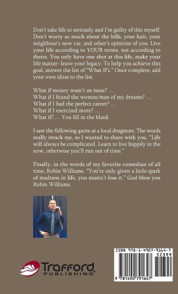 Don't take life so seriously and I'm guilty of this myself. Don't worry so much about the bills, your hair, your neighbour's new car, and other's opinions of you. Live your life according to YOUR terms, not according to theirs. You only have one shot at this life, make your life matter- leave your legacy. To help you achieve this goal, answer the list of "What If's." Once complete, add your own ideas to the list. What if money wasn't an issue? ... What if I found the woman/man of my dreams? ... What if I had the perfect career? ... What if I exercised more? ... What if? ... You fill in the blank I saw the following quote at a local drugstore. The words really struck me, so I wanted to share with you. "Life will always be complicated. Learn to live happily in the now, otherwise you'll run out of time." Finally, in the words of my favorite comedian of all time, Robin Williams. "You're only given a little spark of madness in life, you mustn't lose it." God bless you Robin Williams.
