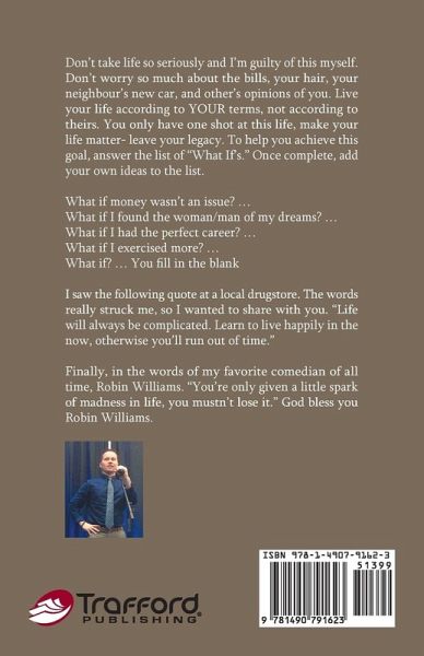 Don't take life so seriously and I'm guilty of this myself. Don't worry so much about the bills, your hair, your neighbour's new car, and other's opinions of you. Live your life according to YOUR terms, not according to theirs. You only have one shot at this life, make your life matter- leave your legacy. To help you achieve this goal, answer the list of "What If's." Once complete, add your own ideas to the list. What if money wasn't an issue? ... What if I found the woman/man of my dreams? ... What if I had the perfect career? ... What if I exercised more? ... What if? ... You fill in the blank I saw the following quote at a local drugstore. The words really struck me, so I wanted to share with you. "Life will always be complicated. Learn to live happily in the now, otherwise you'll run out of time." Finally, in the words of my favorite comedian of all time, Robin Williams. "You're only given a little spark of madness in life, you mustn't lose it." God bless you Robin Williams.