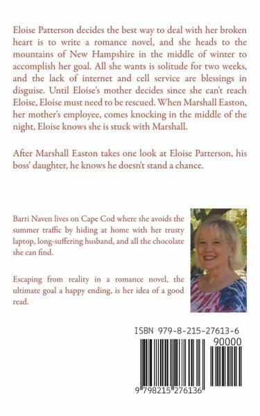 Eloise Patterson decides the best way to deal with her broken heart is to write a romance novel, and she heads to the mountains of New Hampshire in the middle of winter to accomplish her goal. All she wants is solitude for two weeks, and the lack of internet and cell service are blessings in disguise. Until Eloise's mother decides since she can't reach Eloise, Eloise must need to be rescued. When Marshall Easton, her mother's employee, comes knocking in the middle of the night, Eloise knows she is stuck with Marshall. After Marshall Easton takes one look at Eloise Patterson, his boss' daughter, he knows he doesn't stand a chance.