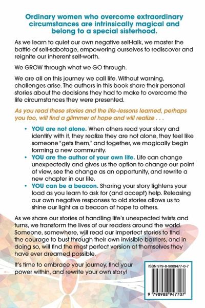 Ordinary women who overcome extraordinary circumstances are intrinsically magical and belong to a special sisterhood. As we learn to quiet our own negative self-talk, we master the battle of self-sabotage, empowering ourselves to rediscover and reignite our inherent self-worth. We GROW through what we GO through. We are all on this journey we call life. Without warning, challenges arise. The authors in this book share their personal stories about the decisions they had to make to overcome the life circumstances they were presented. As you read these stories and the life-lessons learned, perhaps you too, will find a glimmer of hope and will realize . . .YOU are not alone. When others read your story and identify with it, they realize they are not alone, they feel like someone "gets them," and together, we magically begin forming a new community. YOU are the author of your own life. Life can change unexpectedly and gives us the option to change our point of view, see the change as an opportunity, and rewrite a new chapter in our life. YOU can be a beacon. Sharing your story lightens your load as you learn to ask for (and accept) help. Releasing our own negative responses to old stories allows us to shine our light as a beacon of hope to others. As we share our stories of handling life's unexpected twists and turns, we transform the lives of our readers around the world. Someone, somewhere, will read our imperfect stories to find the courage to bust through their own invisible barriers, and in doing so, will find the most perfect version of themselves they have ever dreamed possible. It's time to embrace your journey, find your power within, and rewrite your own story!