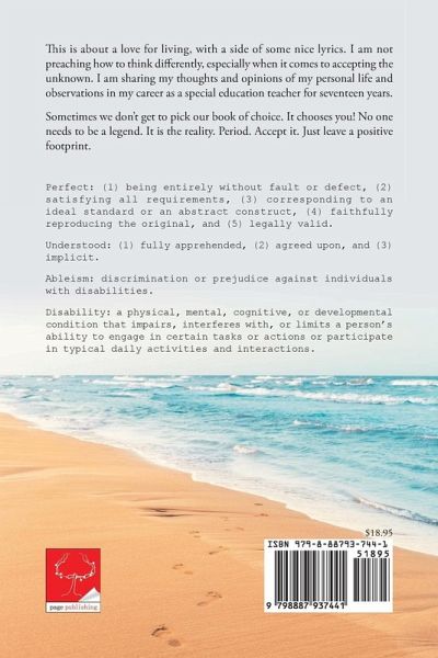 This is about a love for living, with a side of some nice lyrics. I am not preaching how to think differently, especially when it comes to accepting the unknown. I am sharing my thoughts and opinions of my personal life and observations in my career as a special education teacher for seventeen years. Sometimes we don't get to pick our book of choice. It chooses you! No one needs to be a legend. It is the reality. Period. Accept it. Just leave a positive footprint. Perfect: (1) being entirely without fault or defect, (2) satisfying all requirements, (3) corresponding to an ideal standard or an abstract construct, (4) faithfully reproducing the original, and (5) legally valid. Understood: (1) fully apprehended, (2) agreed upon, and (3) implicit. Ableism: discrimination or prejudice against individuals with disabilities. Disability: a physical, mental, cognitive, or developmental condition that impairs, interferes with, or limits a person's ability to engage in certain tasks or actions or participate in typical daily activities and interactions.