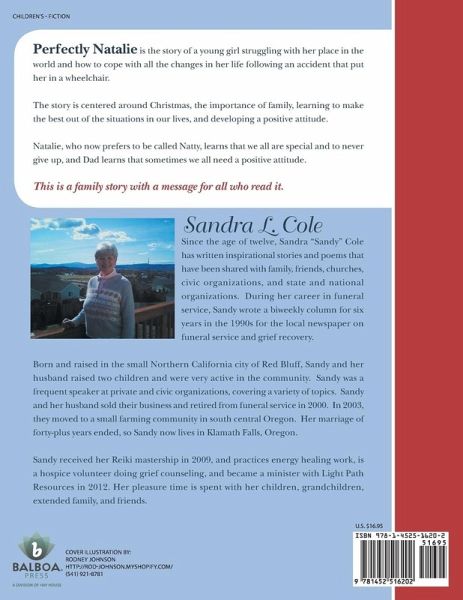Perfectly Natalie is the story of a young girl struggling with her place in the world and how to cope with all the changes in her life following an accident that put her in a wheelchair. The story is centered around Christmas, the importance of family, learning to make the best out of the situations in our lives, and developing a positive attitude. Natalie, who now prefers to be called Natty, learns that we all are special and to never give up, and Dad learns that sometimes we all need a positive attitude. This is a family story with a message for all who read it.
