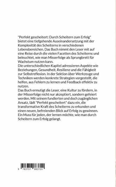 In "Perfekt gescheitert: Durch Scheitern zum Erfolg" navigieren Leser durch eine erhellende Reise, die sich dem oft tabuisierten Thema des Scheiterns annimmt und es aus verschiedenen Blickwinkeln beleuchtet. Das Herzstück des Buches ist die Anerkennung des Scheiterns als unvermeidlicher und sogar wertvoller Teil des Lebens.Die frühen Kapitel gehen sorgfältig die Komplexität von Beziehungen und das Scheitern in diesem Kontext durch. Ein tiefes Eintauchen in die Materie offenbart, dass die Kommunikation über Misserfolge und das Bewusstsein für die Rolle des Scheiterns beim Aufbau tieferer Bindungen wesentlich sind. Es wird nicht nur eine Sichtweise, sondern eine Gelegenheit präsentiert, wie durch transparente Gespräche ein solides Fundament geschaffen werden kann.Während der Entdeckungsreise werden die Leser in die Welt der Gesundheit und des Wohlbefindens entführt, wobei ein besonderer Fokus auf die Vorteile von Sport und Bewegung gelegt wird, um mit Rückschlägen umzugehen. Auch die Bedeutung einer ausgewogenen Ernährung zur Stärkung der emotionalen Resilienz wird nicht außer Acht gelassen. In diesem Segment wird sorgfältig geprüft, wie individuelle Werkzeuge und Techniken entwickelt werden können, um eine gesündere, resiliente Persönlichkeit zu fördern.Die abschließenden Abschnitte legen den Schwerpunkt auf die Resilienz und Erholung, mit klaren Strategien zur Stärkung der inneren Widerstandsfähigkeit und der Betonung der zentralen Rolle sozialer Unterstützung und Gemeinschaft. Die Lektüre gipfelt in einem inspirierenden Plädoyer für eine Kultur, die Misserfolge feiert, und präsentiert den Lesern eine kraftvolle Perspektive, die die transformative Kraft des Scheiterns feiert."Perfekt gescheitert: Durch Scheitern zum Erfolg" ist nicht nur eine Anleitung für den individuellen Weg durch die Schwierigkeiten des Lebens, sondern auch ein Aufruf zu einer gesellschaftlichen Verschiebung in der Wahrnehmung von Scheitern und Erfolg. Mit einer klugen Mischung aus praktischen Ratschlägen und tiefer Reflexion ist dieses Buch ein unverzichtbarer Begleiter für alle, die sich auf die Suche nach Widerstandsfähigkeit und persönlicher Transformation begeben wollen.
