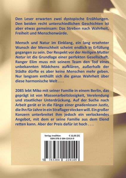 Den Leser erwarten zwei dystopische Erzählungen. Den beiden recht unterschiedlichen Geschichten ist aber etwas gemeinsam: Das Streben nach Wahrheit, Freiheit und Menschenwürde.Mensch und Natur im Einklang, ein lang ersehnter Wunsch der Menschheit scheint endlich in Erfüllung gegangen zu sein. Der Respekt vor der Heiligen Mutter Natur ist die Grundlage einer perfekten Gesellschaft. Ranger Elim muss mit seinem Team den Tod eines unbekannten Mädchens aufklären, außerhalb der Städte dürfte es aber keine Menschen mehr geben. Nur langsam enthüllt sich die ganze Wahrheit über diese harmonische Welt . . .2085 lebt Miko mit seiner Familie in einem Berlin, das geprägt ist von Massenarbeitslosigkeit, Verelendung und staatlicher Unterdrückung. Auf der Suche nach Arbeit gerät er in die Fänge einer gnadenlosen Justiz, die ihn für Jahre in ein Straflager stecken will. Ein großer Konzern unterbreitet ihm jedoch ein verlockendesAngebot, mit dem er seine Familie aus dem Elend retten kann. Aber derPreis dafür ist hoch . . .