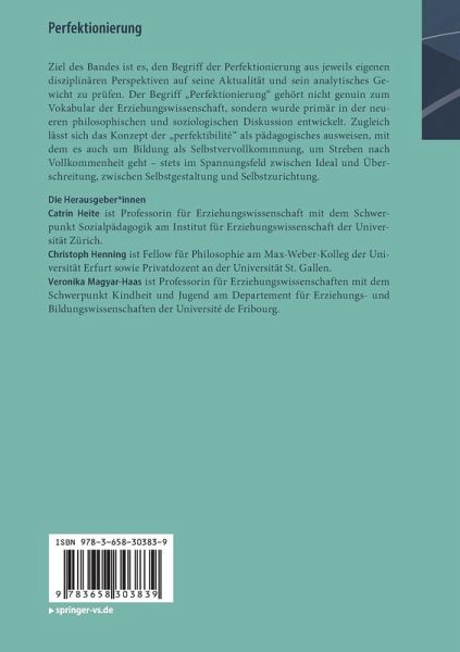 Perfektionierung, Perfektibilität, Optimierung: Zu philosophischer Arbeit an Begriffen.- Erziehungswissenschaftliche Perspektiven auf die Genealogie der Perfektionierung und Optimierung.- Zu soziologischen Kritiken.- Zukünfte der Perfektionierung.
