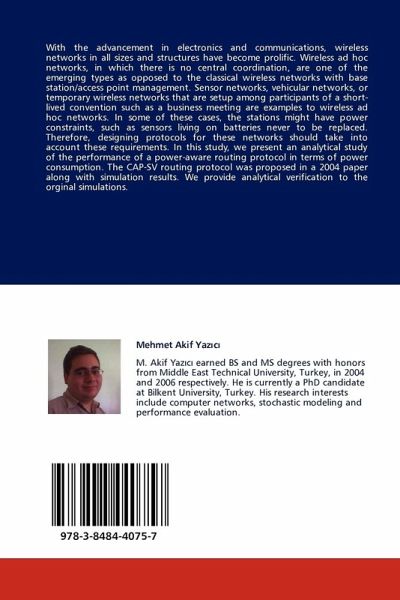 With the advancement in electronics and communications, wireless networks in all sizes and structures have become prolific. Wireless ad hoc networks, in which there is no central coordination, are one of the emerging types as opposed to the classical wireless networks with base station/access point management. Sensor networks, vehicular networks, or temporary wireless networks that are setup among participants of a short-lived convention such as a business meeting are examples to wireless ad hoc networks. In some of these cases, the stations might have power constraints, such as sensors living on batteries never to be replaced. Therefore, designing protocols for these networks should take into account these requirements. In this study, we present an analytical study of the performance of a power-aware routing protocol in terms of power consumption. The CAP-SV routing protocol was proposed in a 2004 paper along with simulation results. We provide analytical verification to the orginal simulations.