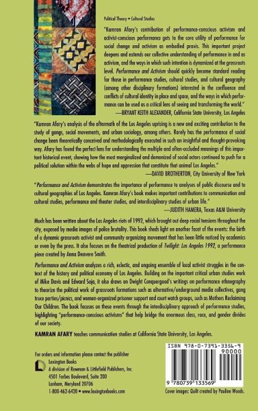 Afary's contribution of performance-conscious activism and activist-conscious performance gets to the core utility of performance for social change and activism as embodied praxis. This important project deepens and extends our collective understanding of performance in and as activism and the ways in which such intention is dynamized on the grassroots level. Performance and Activism should quickly become standard reading for those in performance studies, cultural studies, and cultural geography, amongst other disciplinary formations, interested in the confluence and conflicts of cultural identity in place and space, and the ways in which performance can be used as a critical lens of seeing and transforming the world. -- Bryant Keith Alexander, California State University Los Angeles Performance and Activism demonstrates the importance of performance to analyses of public discourse and to cultural geographies of Los Angeles. Kamran Afary's book makes important contributions to communication and cultural studies, performance and theatre studies, and interdisciplinary studies of urban life. -- Texas A&M University Kamran Afary's analysis of the aftermath of the Los Angeles uprising is a new and exciting contribution to the study of gangs, social movements and urban sociology among others. Rarely has the performance of social change been theoretically conceived and methodologically executed in such an insightful and thought-provoking way. Afary has found the perfect lens for understanding the multiple and often occluded meanings of this important historical event, showing how the most marginalized and demonized of social actors continued to push for a political solution within the webs of hope and oppression that constitute that animal Los Angeles. -- David Brotherton, The City University of New York
