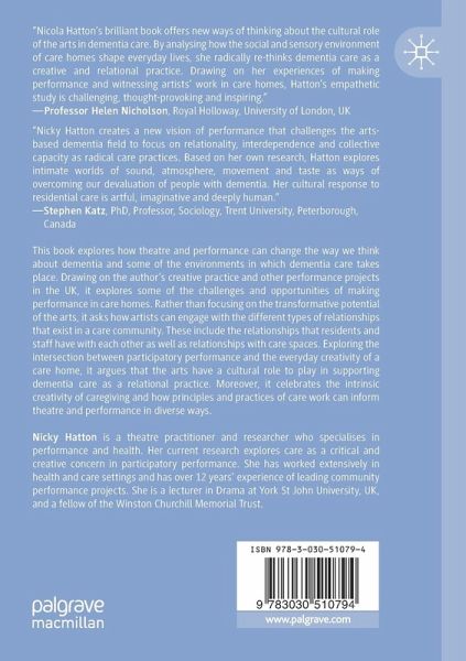 This book explores how theatre and performance can change the way we think about dementia and some of the environments in which dementia care takes place. Drawing on the author's creative practice and other performance projects in the UK, it explores some of the challenges and opportunities of making performance in care homes. Rather than focusing on the transformative potential of the arts, it asks how artists can engage with the different types of relationships that exist in a care community. These include the relationships that residents and staff have with each other as well as relationships with care spaces. Exploring the intersection between participatory performance and the everyday creativity of a care home, it argues that the arts have a cultural role to play in supporting dementia care as a relational practice. Moreover, it celebrates the intrinsic creativity of caregiving and how principles and practices of care work can inform theatre and performance in diverse ways.