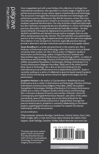 List of Illustrations Notes on Contributors Introduction; Body, Space and Technology; S.Broadhurst& J.Machon Bodies Without Bodies; S.Melrose Truth-Seeker's Allowance: Digitising Artaud; S.Dixon Transformed Landscapes; The Choreographic Displacement of Location and Locomotion in Film; J.J.Cook Saira Virous : Game Choreography in Multiplayer Online Performance Spaces; J.Birringer Artistic Considerations in the Use of Motion Tracking with Live Performers: A Practical Guide; R.Wechsler Materials vs. Content in Digitally Mediated Performance; M.Coniglio Learning to Dance with Angelfish; Choreographic Encounters between Virtuality and Reality; C.Brown Kinaesthetic Traces across Material Forms; G.Schiller Sensuous Geographics and Fugitive Moments ; The Interface of Body and Technology; S.Rubidge Body Waves Sound Waves; B.Edwards& B.Jarlett Intelligence, Interaction, Reaction, and Performance; S.Broadhurst The Tissue Culture and Art Project; O.Catts& I.Zurr Addenda, Phenomenology, Embodiment: Cyborgs and Disability Performance; P.Kuppers Technology as Bridge to Greater Audience Participation; C.Carson Afterword; P.Auslander Index