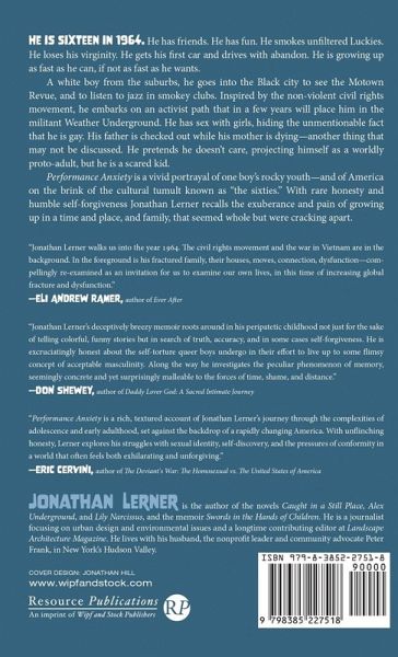 He is sixteen in 1964. He has friends. He has fun. He smokes unfiltered Luckies. He loses his virginity. He gets his first car and drives with abandon. He is growing up as fast as he can, if not as fast as he wants. A white boy from the suburbs, he goes into the Black city to see the Motown Revue, and to listen to jazz in smokey clubs. Inspired by the non-violent civil rights movement, he embarks on an activist path that in a few years will place him in the militant Weather Underground. He has sex with girls, hiding the unmentionable fact that he is gay. His father is checked out while his mother is dying--another thing that may not be discussed. He pretends he doesn't care, projecting himself as a worldly proto-adult, but he is a scared kid. Performance Anxiety is a vivid portrayal of one boy's rocky youth--and of America on the brink of the cultural tumult known as ""the sixties."" With rare honesty and humble self-forgiveness Jonathan Lerner recalls the exuberance and pain of growing up in a time and place, and family, that seemed whole but were cracking apart.