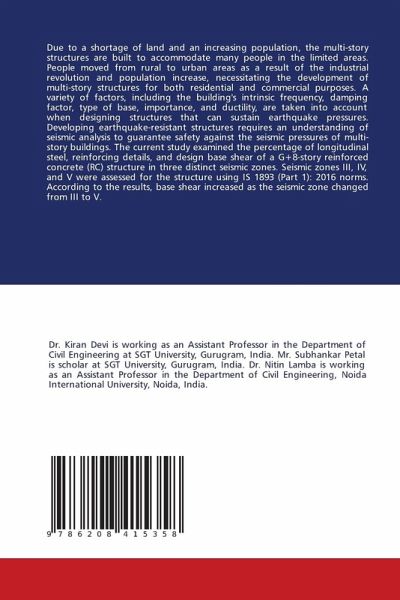 Due to a shortage of land and an increasing population, the multi-story structures are built to accommodate many people in the limited areas. People moved from rural to urban areas as a result of the industrial revolution and population increase, necessitating the development of multi-story structures for both residential and commercial purposes. A variety of factors, including the building's intrinsic frequency, damping factor, type of base, importance, and ductility, are taken into account when designing structures that can sustain earthquake pressures. Developing earthquake-resistant structures requires an understanding of seismic analysis to guarantee safety against the seismic pressures of multi-story buildings. The current study examined the percentage of longitudinal steel, reinforcing details, and design base shear of a G+8-story reinforced concrete (RC) structure in three distinct seismic zones. Seismic zones III, IV, and V were assessed for the structure using IS 1893 (Part 1): 2016 norms. According to the results, base shear increased as the seismic zone changed from III to V.