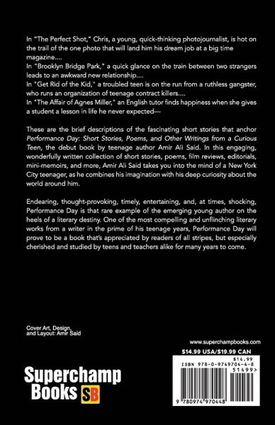 Performance Day: Short Stories, Poems, and Other Writings from a Curious Teen, the debut book by teenage author Amir Ali Said. In this engaging, wonderfully written collection of short stories, poems, film reviews, editorials, mini-memoirs, and more, Amir Ali Said takes you into the mind of a New York City teenager, as he combines his imagination with his deep curiosity about the world around him. Endearing, thought-provoking, timely, entertaining, and, at times, shocking, Performance Day is that rare example of the emerging young author on the heels of a literary destiny. One of the most compelling and unflinching literary works from a writer in the prime of his teenage years, Performance Day will prove to be a book that's appreciated by readers of all stripes, but especially cherished and studied by teens and teachers alike for many years to come.