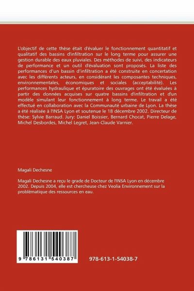 L'objectif de cette thèse était d'évaluer le fonctionnement quantitatif et qualitatif des bassins d'infiltration sur le long terme pour assurer une gestion durable des eaux pluviales. Des méthodes de suivi, des indicateurs de performance et un outil d'évaluation sont proposés. La liste des performances d'un bassin d'infiltration a été construite en concertation avec les différents acteurs, en considérant les composantes techniques, environnementales, économiques et sociales (acceptabilité). Les performances hydraulique et épuratoire des ouvrages ont été évaluées à partir des données acquises sur quatre bassins d'infiltration et d'un modèle simulant leur fonctionnement à long terme. Le travail a été effectué en collaboration avec la Communauté urbaine de Lyon. La thèse a été réalisée à l'INSA Lyon et soutenue le 18 décembre 2002. Directeur de thèse: Sylvie Barraud. Jury: Daniel Boissier, Bernard Chocat, Pierre Delage, Michel Desbordes, Michel Legret, Jean-Claude Varnier.