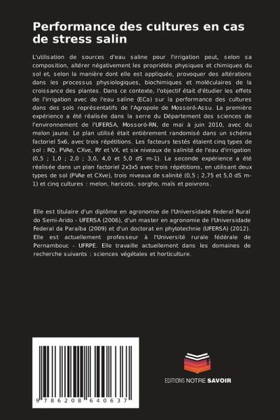 L'utilisation de sources d'eau saline pour l'irrigation peut, selon sa composition, altérer négativement les propriétés physiques et chimiques du sol et, selon la manière dont elle est appliquée, provoquer des altérations dans les processus physiologiques, biochimiques et moléculaires de la croissance des plantes. Dans ce contexte, l'objectif était d'étudier les effets de l'irrigation avec de l'eau saline (ECa) sur la performance des cultures dans des sols représentatifs de l'Agropole de Mossoró-Assu. La première expérience a été réalisée dans la serre du Département des sciences de l'environnement de l'UFERSA, Mossoró-RN, de mai à juin 2010, avec du melon jaune. Le plan utilisé était entièrement randomisé dans un schéma factoriel 5x6, avec trois répétitions. Les facteurs testés étaient cinq types de sol : RQ, PVAe, CXve, RY et VX, et six niveaux de salinité de l'eau d'irrigation (0,5 ; 1,0 ; 2,0 ; 3,0, 4,0 et 5,0 dS m-1). La seconde expérience a été réalisée dans un plan factoriel 2x3x5 avec trois répétitions, en utilisant deux types de sol (PVAe et CXve), trois niveaux de salinité (0,5 ; 2,75 et 5,0 dS m-1) et cinq cultures : melon, haricots, sorgho, maïs et poivrons.