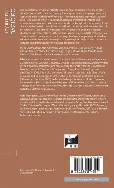 List of illustrations Series editors' preface Acknowledgements Notes on contributors Introduction: Framing 'America': Between Exilic Imaginary and Exilic Collective; S.Jestrovic & Y.Meerzon PART 1: 'AMERICA' BETWEEN THE EXILIC IMAGINARY AND THE EXILIC COLLECTIVE Land of Air-conditioning and Opportunity: America on the Irish Stage; E.Fitzpatrick Ninety Miles Away: Exile and Identity in Recent Cuban-American Dramas; Y.Prizant An American Mile in Others' Shoes' - The Tragicomedy of Immigrating to the 21st Century U.S.; D.Manole The American Landscape Reconsidered. On Theatricality of Urban America in the Russian Émigré Writings, with the special focus on Vasily Aksyonov's works; Y.Meerzon PART 2: AMERICAN PERFORMATIVITY Theatres in America: Brecht and Kafka; F.Rokem America Relocated - Karel Capek's Robots between Prague, Berlin and New York; V.Ambros At Home in Exile: Finding America in Casablanca and Camino Real ; A.Ackerman PART 3: AMERICA AND THE OTHER: FROM REPRESENTATION TO INTERVENTION De-Territorializing Voices: Staging the Middle East in American Theatre; E.Jaffe-Berg Current Trends in Arab-American Performance; D.Basiouny & M.Carlson Bombing (on) the Border: Ali& Ali and the aXes of Evil as Transnational Agitprop; J.Wasserman Exiles and the City: Krzysztof Wodiczko's New York Interventions of Making the Familiar Strange; S.Jestrovic Index