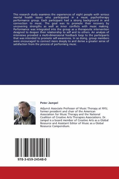 This research study examines the experiences of eight people with serious mental health issues who participated in a music psychotherapy performance group. Each participant had a strong background in and connection to music. The goal was to promote their recovery by uncovering strengths as well as inner conflicts with music making. Performance was integrated into the group as a therapeutic intervention designed to deepen their relationship to self and to others. An analysis of interviews provided a multi-dimensional feedback loop to the participants that was intended to promote self-awareness. In so doing, group members were encouraged to connect more deeply to and derive a greater sense of satisfaction from the process of performing music.