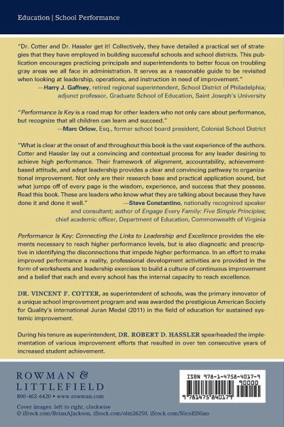 Nationally, teachers, administrators, school board members and other stakeholders are increasingly concerned about the status of student achievement. Lawmakers have often sought "silver bullet" and "quick fix" solutions to the complex problem of improving school performance with little or no impact. Performance is Key "opens the door" to Connecting the Links to Leadership and Excellence by providing the essential elements necessary to reach higher performance levels but is also diagnostic and prescriptive in identifying the disconnections that impede higher performance and provides practical solutions through a framework for improvement along with associated success strategies. Practitioners and aspiring leaders will appreciate not only the rationale for immediate action but the systemic approach to excellence. Dr. Vince Cotter and Dr. Bob Hassler recognize that it is often the subtle nuances of how and what we do that can make a difference between success and failure. Too often reflection is overlooked in its potential to assess the status of an organization and its ability to provide direction to leaders in moving an organization toward higher performance. Poignant and thought provoking questions assist to position a leader's thinking, overview and focus on performance. Performance is Key also recognizes that real sustainable solutions are internally developed in a collaborative manner and that all schools and districts have the capacity to improve performance outcomes. To further assist educational leaders, a framework and an assessment instrument "crosscheck" the operational nature of key elements for success among school and district stakeholders. While common "pitfalls" to higher performance are noted, leaders are provided with a host of practical tools, strategies and recommendations to overcome obstacles, build internal support and to reach higher levels of performance. Performance is Key will demonstrate the importance of utilizing the four essential elements in a coordinated and collaborative manner and how leaders can execute implementation plans which incorporate those elements in a synergistic way that will lead to high performance. In an effort to make improved performance a reality, professional development activities are provided in the form of worksheets and leadership exercises to build a culture of continuous improvement and a belief that each and every school has the internal capacity to reach excellence.