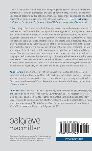 "This collection, edited by Anna Harpin and Juliet Foster, works across performance and medicine, with a specific focus on 'madness' and psychiatry, and performances of and in the asylum. ... This is exciting and important work, capturing a pivotal moment in understanding particular histories of mental illness as it relates to site and performance." (Gianna Bouchard, Contemporary Theatre Review, Vol. 26 (1), February, 2016)