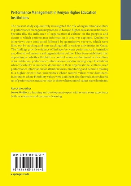 The present study exploratively investigated the role of organizational culture in performance management practices in Kenyan higher education institutions. Specifically, the influence of organizational culture on the purpose and extent to which performance information is used was explored. Qualitative interviews were conducted followed by quantitative surveys, which were filled out by teaching and non-teaching staff in various universities in Kenya. The findings provide evidence of linkages between performance information use, diversity of measure and organizational culture. It has been established that, depending on whether flexibility or control values are dominant in the culture of an institution; performance information is used in varying ways. Institutions where flexibility values were dominant in their organizational cultures used performance information for attention focus, monitoring and decision making to a higher extent than universities where control values were dominant. Institutions where Flexibility values were dominant also showed a more diverse set of performance measures than in those where control values were dominant.