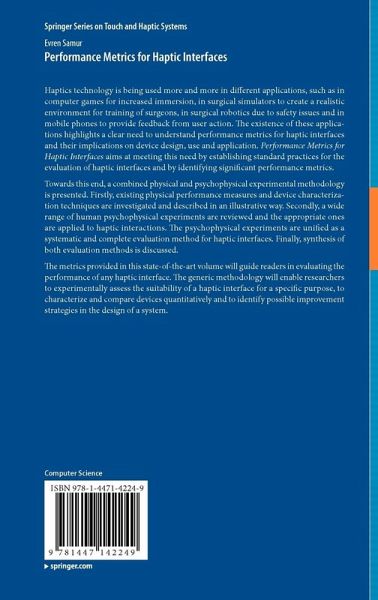 The metrics provided in this state-of-the-art volume will guide readers in evaluating the performance of any haptic interface. The generic methodology will enable researchers to experimentally assess the suitability of a haptic interface for a specific purpose, to characterize and compare devices quantitatively and to identify possible improvement strategies in the design of a system.