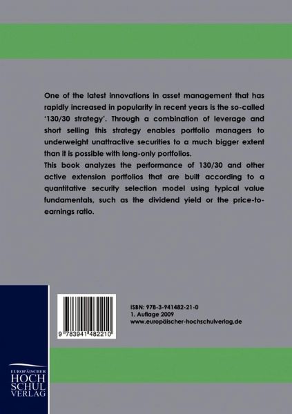 One of the latest innovations in asset management that has rapidly increased in popularity in recent years is the so-called 130/30 strategy . Through a combination of leverage and short selling this strategy enables portfolio managers to underweight unattractive securities to a much bigger extent than it is possible with long-only portfolios. This book analyzes the performance of 130/30 and other active extension portfolios that are built according to a quantitative security selection model using typical value fundamentals, such as the dividend yield or the price-to-earnings ratio. In comparison to the benchmark and traditional long-only portfolios the 130/30 strategy does outperform the former two over a 15-year time period from 1993 to early 2008, even after accounting for costs. When analyzing the risk-adjusted returns in more detail it becomes obvious that a 130/30 strategy is an especially promising alternative to passive or active long-only investment strategies in rather weak market phases as they were present during the early years of this decade. That is why a dynamic strategy that switches between 130/30, long-only and index depending on the respective market phase is analyzed as well. When using for example an autoregressive model to select the appropriate strategy such a dynamic approach delivers significantly higher returns than a static active extension portfolio does.