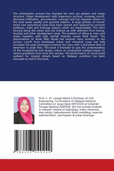 The urbanization process has changed the land use pattern and urban structure. Urban development adds impervious surfaces, increases runoff, decreases infiltration, groundwater recharge and has negative effects on the local water quality and quantity balance. A large portion of former forest and agricultural areas have been cleared and replaced by concrete buildings, roads and drainage systems which are impermeable. The rivers flowing along the urban area are choked up with sediment from mining, housing and other development areas. The problem of silting in rivers and drains together with high rainfall intensity causes flash floods. The phenomenon of these flash floods has become more common as the surface runoff from developed urban and industrial areas has fully increased the peak discharges entering the rivers with a shortened time of detention to peak flow. This book is intended to give the understanding of the fundamental and design criteria of constructed wetland based on various guidelines from local and oversea. The performance of constructed wetland for tropical climate based on Malaysia condition has been discussed as well in this book.