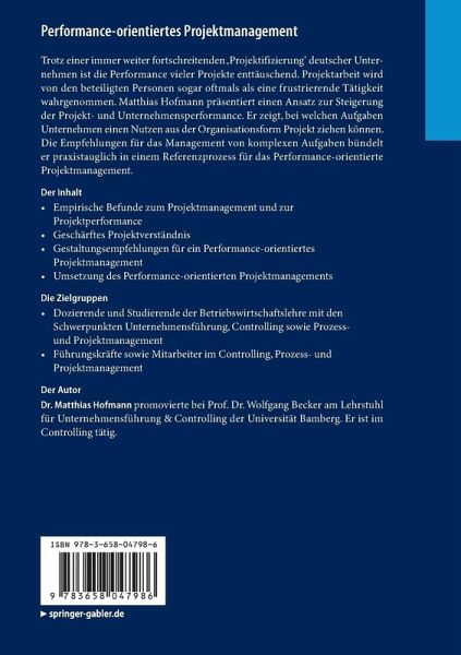 Trotz einer immer weiter fortschreitenden 'Projektifizierung' deutscher Unternehmen ist die Performance vieler Projekte enttäuschend. Projektarbeit wird von den beteiligten Personen sogar oftmals als eine frustrierende Tätigkeit wahrgenommen. Matthias Hofmann präsentiert einen Ansatz zur Steigerung der Projekt- und Unternehmensperformance. Er zeigt, bei welchen Aufgaben Unternehmen einen Nutzen aus der Organisationsform Projekt ziehen können. Die Empfehlungen für das Management von komplexen Aufgaben bündelt er praxistauglich in einem Referenzprozess für das Performance-orientierte Projektmanagement.