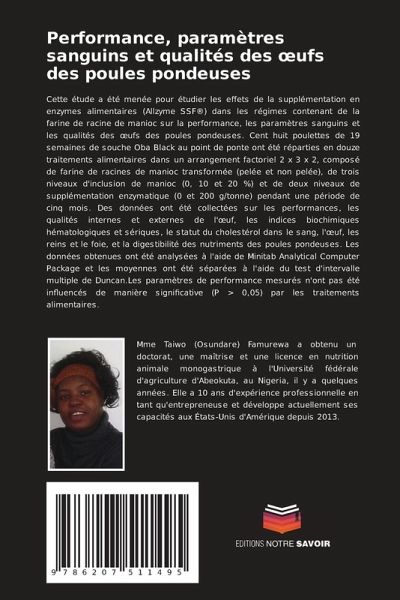 Cette étude a été menée pour étudier les effets de la supplémentation en enzymes alimentaires (Allzyme SSF®) dans les régimes contenant de la farine de racine de manioc sur la performance, les paramètres sanguins et les qualités des oeufs des poules pondeuses. Cent huit poulettes de 19 semaines de souche Oba Black au point de ponte ont été réparties en douze traitements alimentaires dans un arrangement factoriel 2 x 3 x 2, composé de farine de racines de manioc transformée (pelée et non pelée), de trois niveaux d'inclusion de manioc (0, 10 et 20 %) et de deux niveaux de supplémentation enzymatique (0 et 200 g/tonne) pendant une période de cinq mois. Des données ont été collectées sur les performances, les qualités internes et externes de l'oeuf, les indices biochimiques hématologiques et sériques, le statut du cholestérol dans le sang, l'oeuf, les reins et le foie, et la digestibilité des nutriments des poules pondeuses. Les données obtenues ont été analysées à l'aide de Minitab Analytical Computer Package et les moyennes ont été séparées à l'aide du test d'intervalle multiple de Duncan.Les paramètres de performance mesurés n'ont pas été influencés de manière significative (P > 0,05) par les traitements alimentaires.