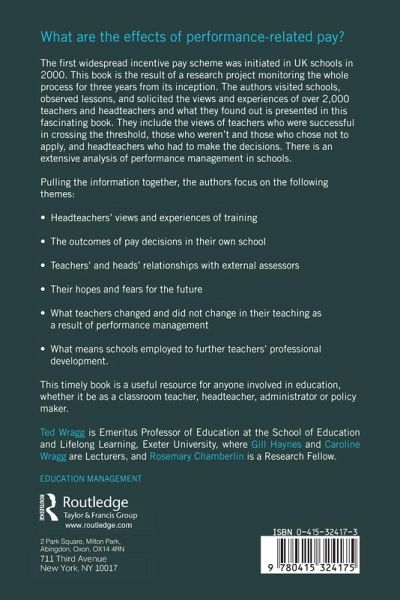 The first widespread incentive pay scheme was initiated in UK schools in 2000. This book is the result of monitoring the whole process from its inception. The authors visited schools, observed lessons, and solicited the views and experiences of a large collection of teachers and headteachers. Their discoveries are presented in this lively book. They include the views of teachers who were successful in crossing the threshold, those who weren't and those who chose not to apply, and headteachers who had to make the decisions. The book focuses on the following schemes: * headteachers' experiences of training * the outcomes in their own school * their relationship with external assessors * their hopes and fears for the future * their assessment of the influence on classroom practice * what did teachers change and not change in their teaching as a result of performance management * what means they employed to further their own professional development. This timely book is a useful resource for anyone involved in education, whether it be a classroom teacher, headteacher, administrator or policy-maker.